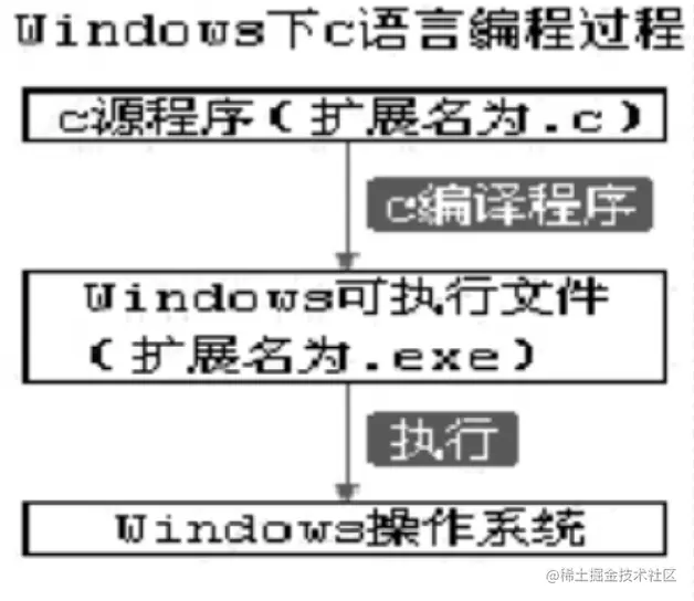 从上图可知,在windows系统下,我们编写的C语言源码文件后缀是.c,在windows平台下进行编译会生成后缀名为.exe的可执行文件,经常安装软件的同学应该对这个.exe后缀不陌生。生成.exe文件后,就可以在windows系统中运行了。