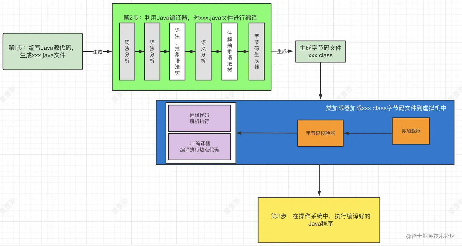 从上图可以看出,Java对代码的处理过程可以分为3个核心步骤: