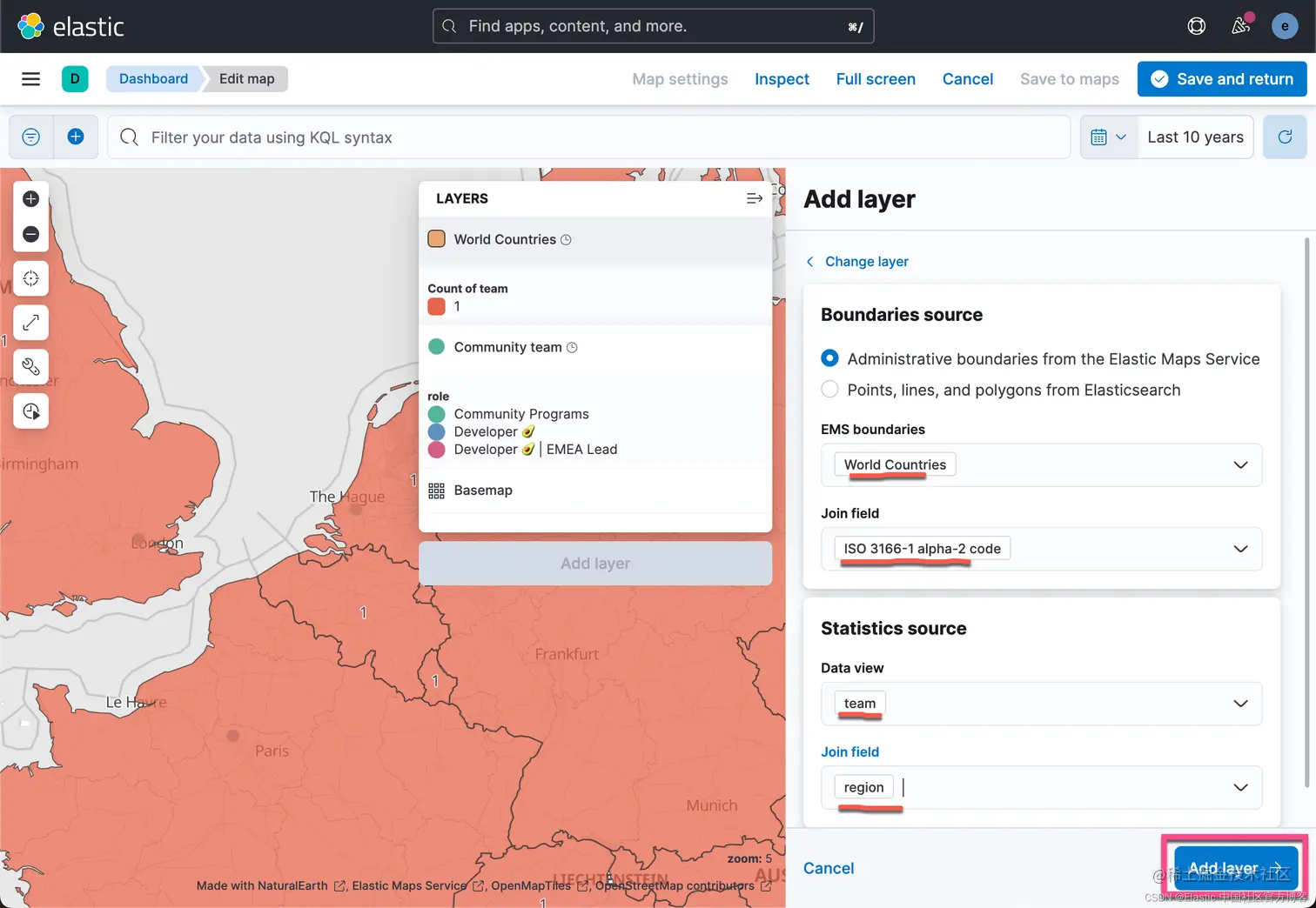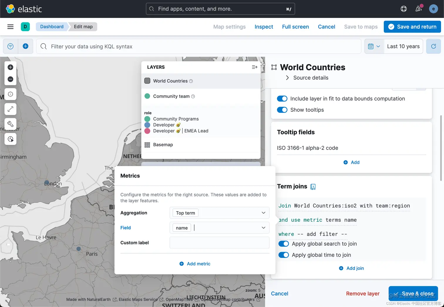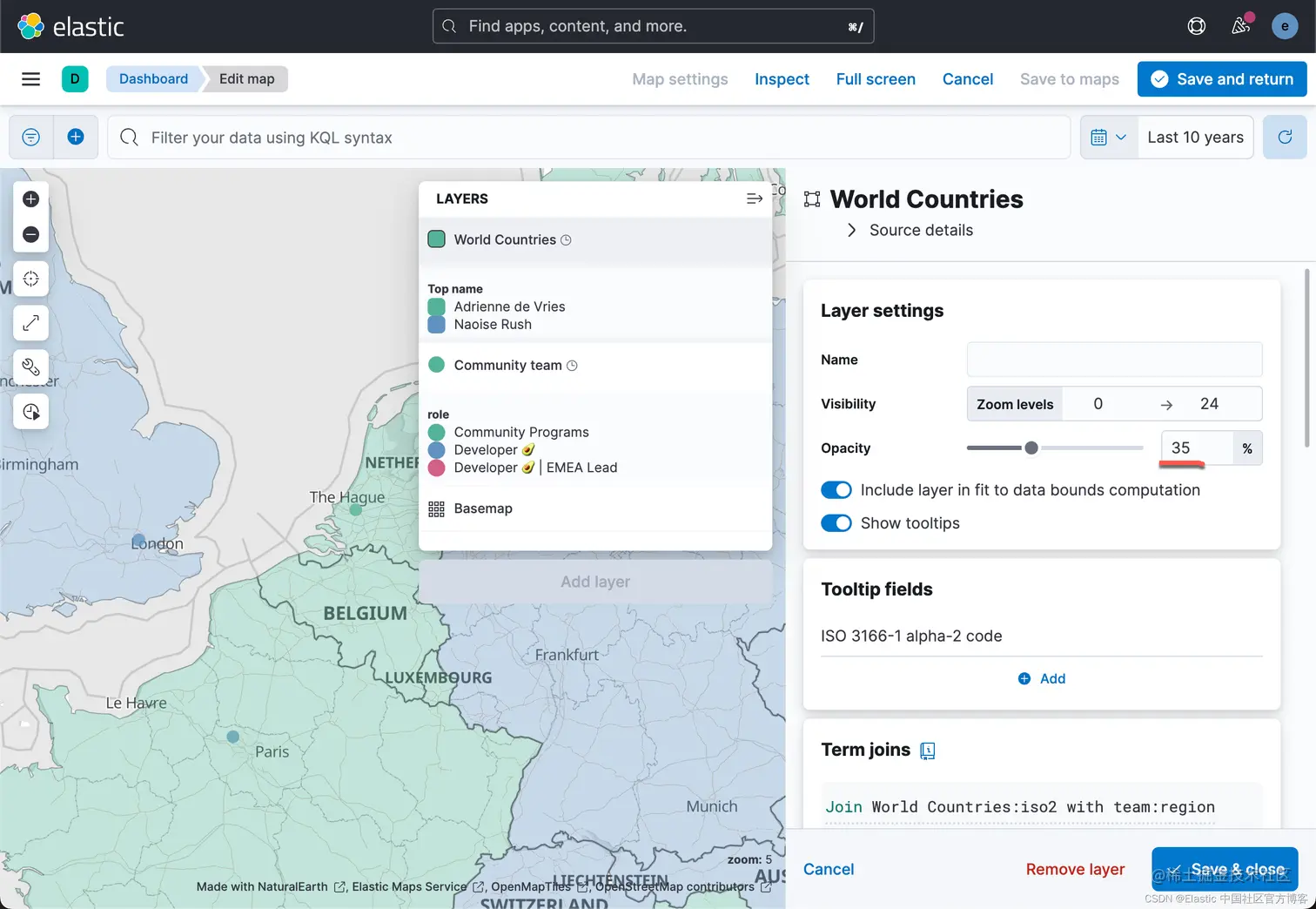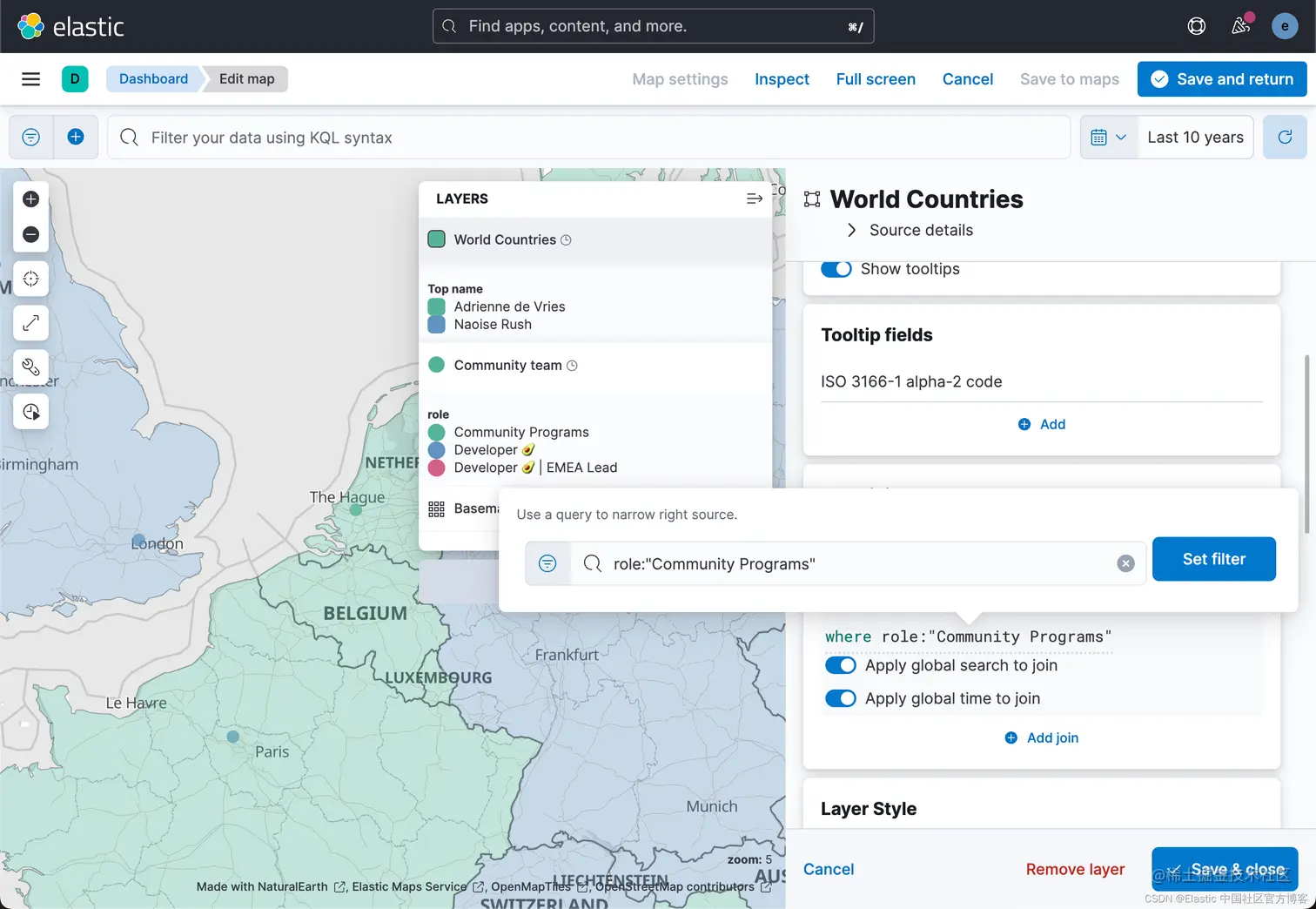 我们团队也有拥有某些区域的概念。 是时候向地图添加另一个图层了——这次是 Choropleth。 Elasticsearch 文档的 region 数组映射到国家/地区的 ISO 3166-1 alpha-2 代码。 我们可以将其限制为 “Community Programs 的角色,因为只有他们拥有区域: