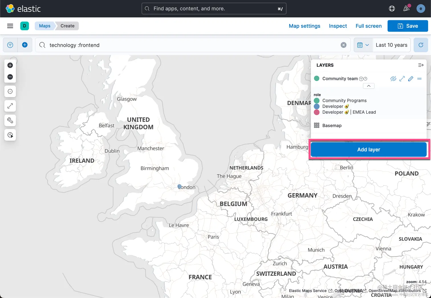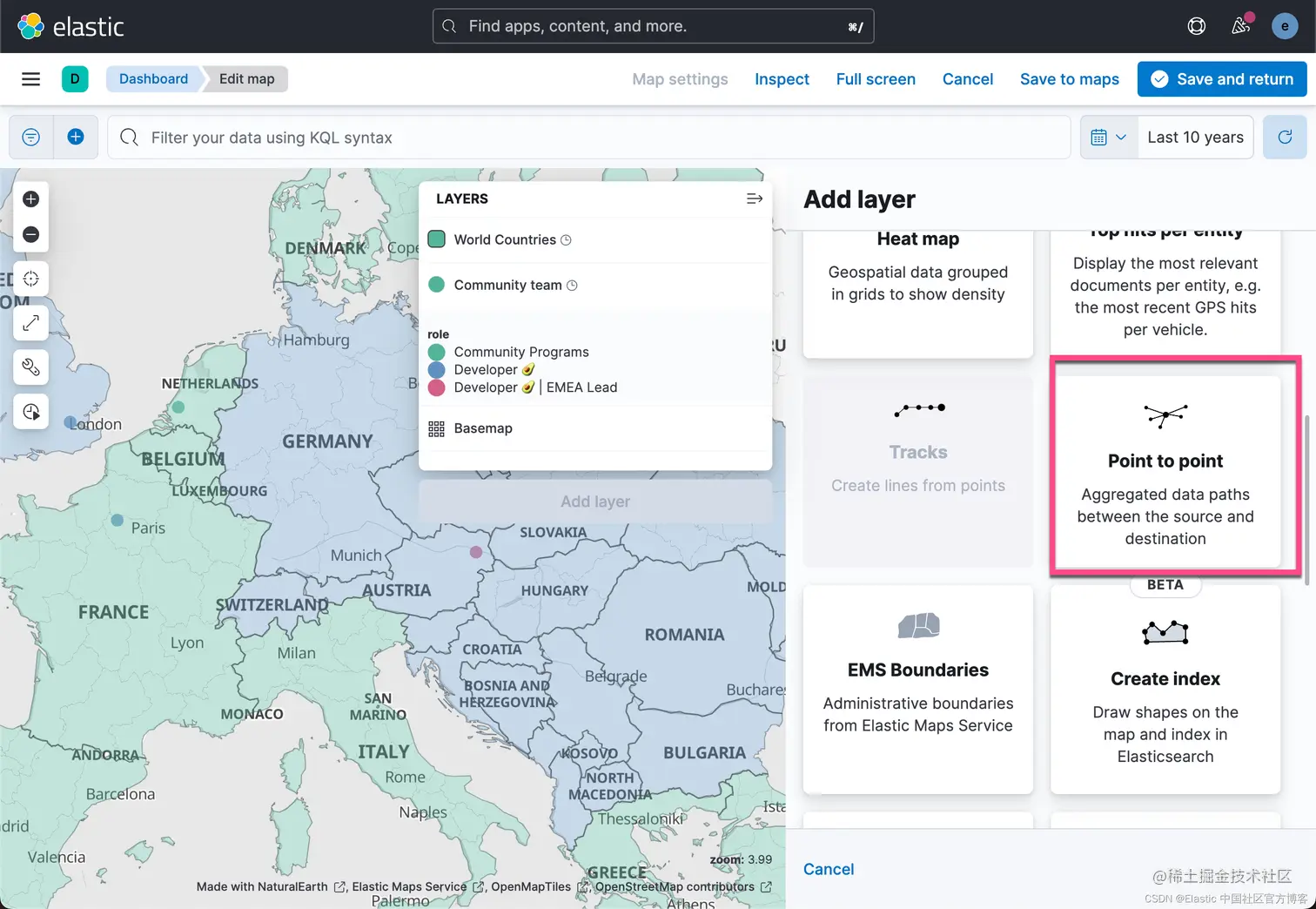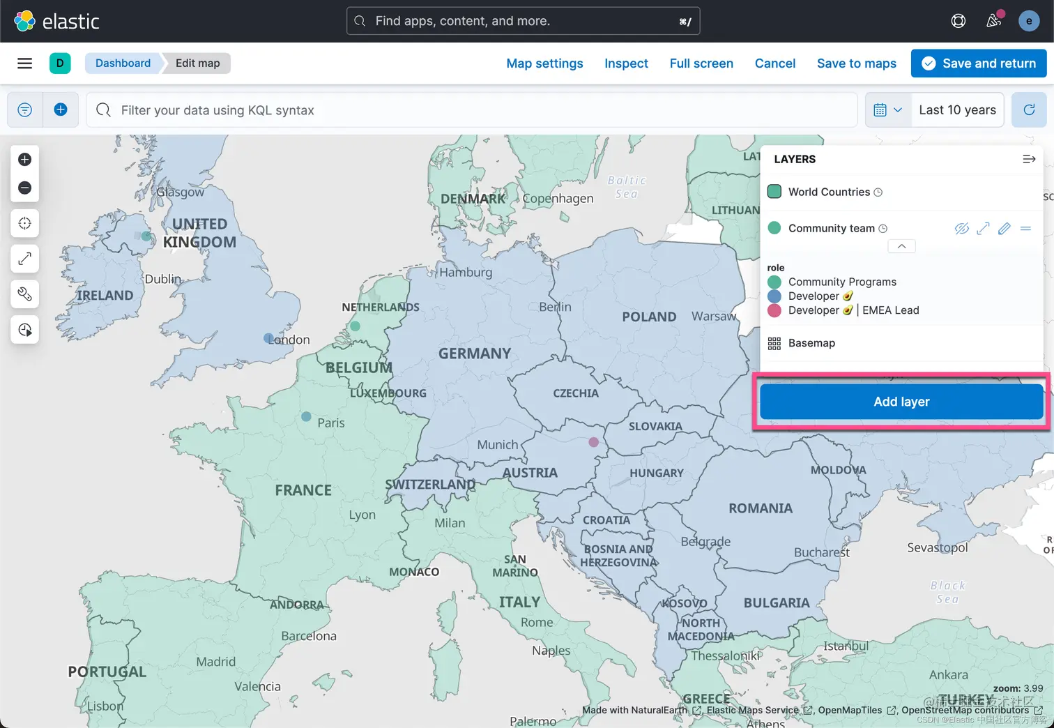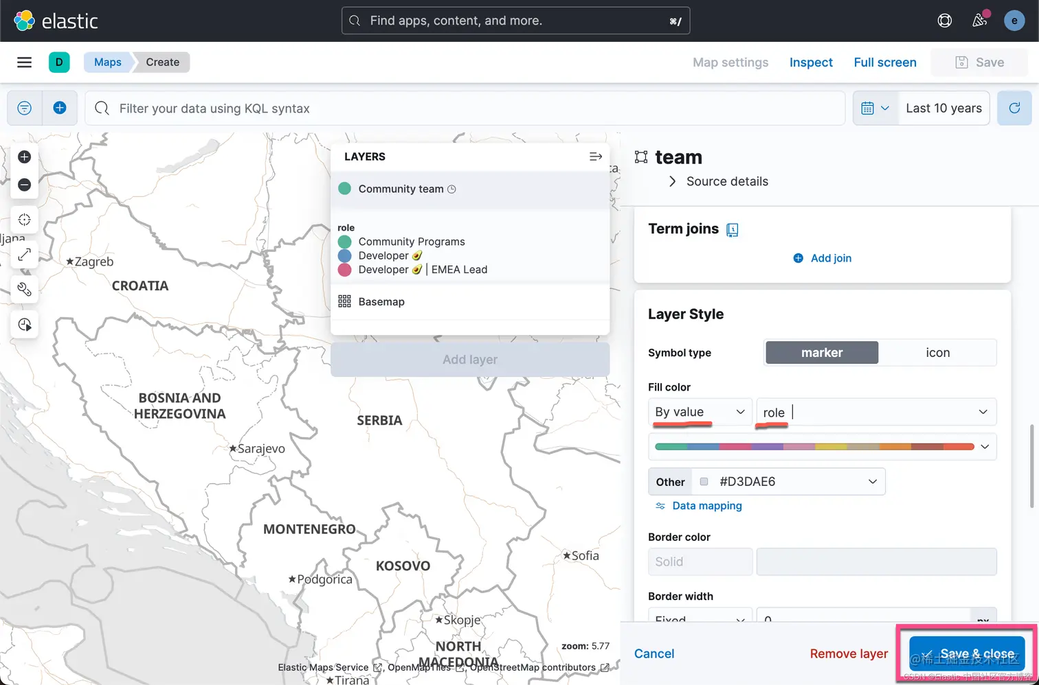 我们团队也有拥有某些区域的概念。 是时候向地图添加另一个图层了——这次是 Choropleth。 Elasticsearch 文档的 region 数组映射到国家/地区的 ISO 3166-1 alpha-2 代码。 我们可以将其限制为 “Community Programs 的角色,因为只有他们拥有区域: