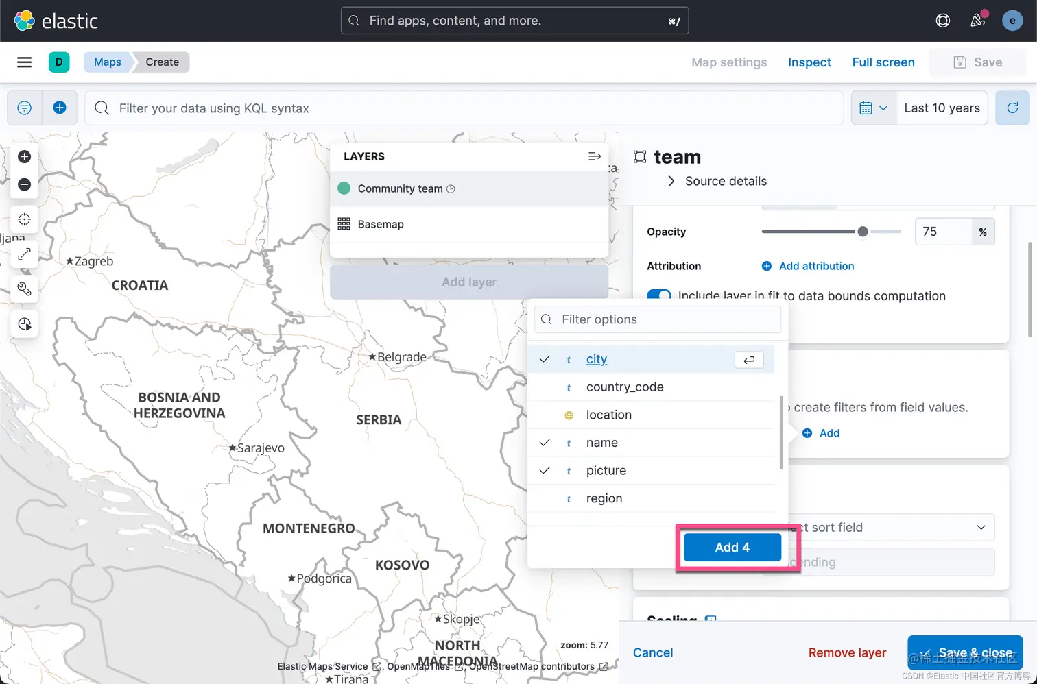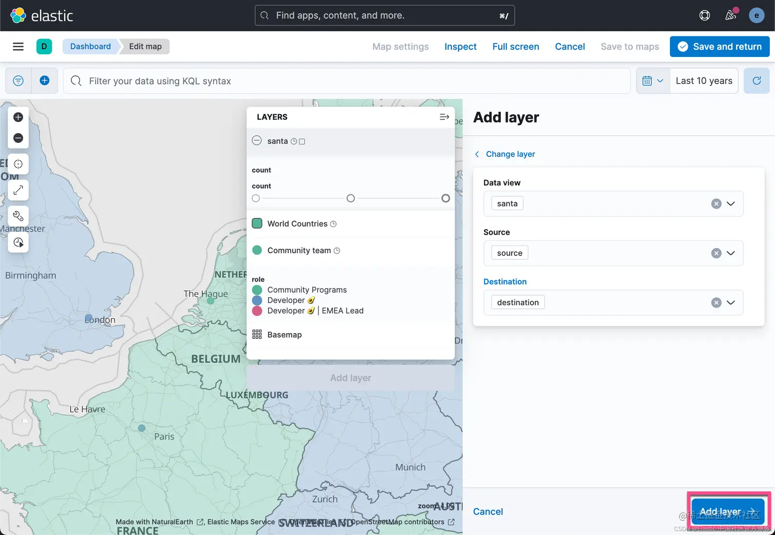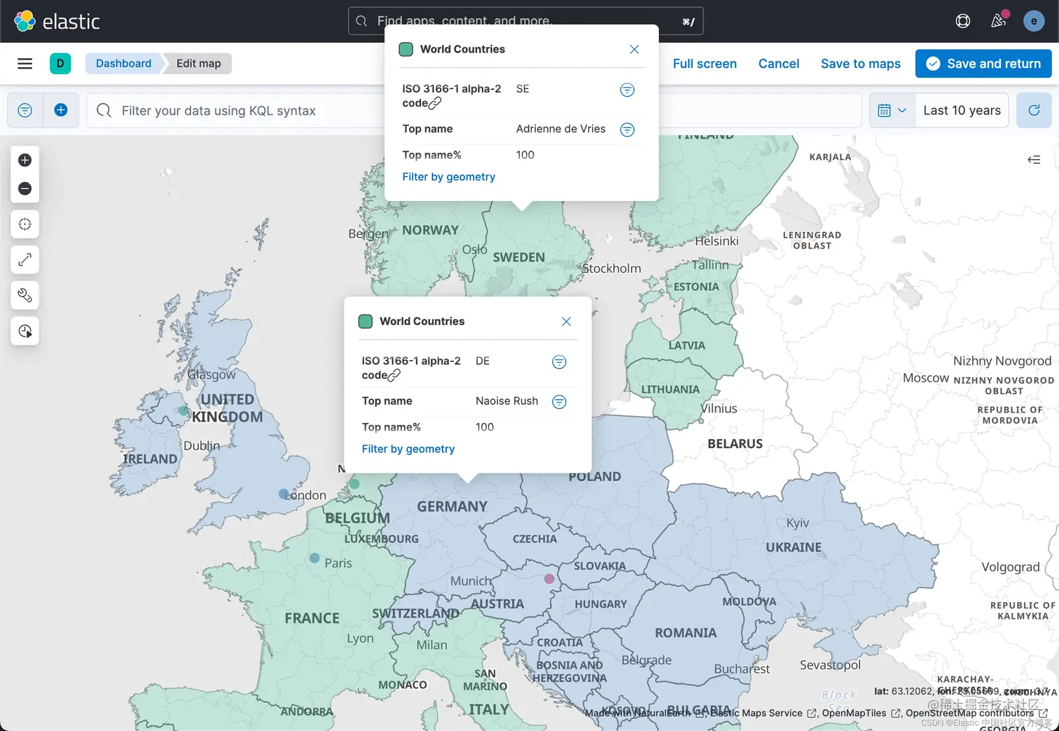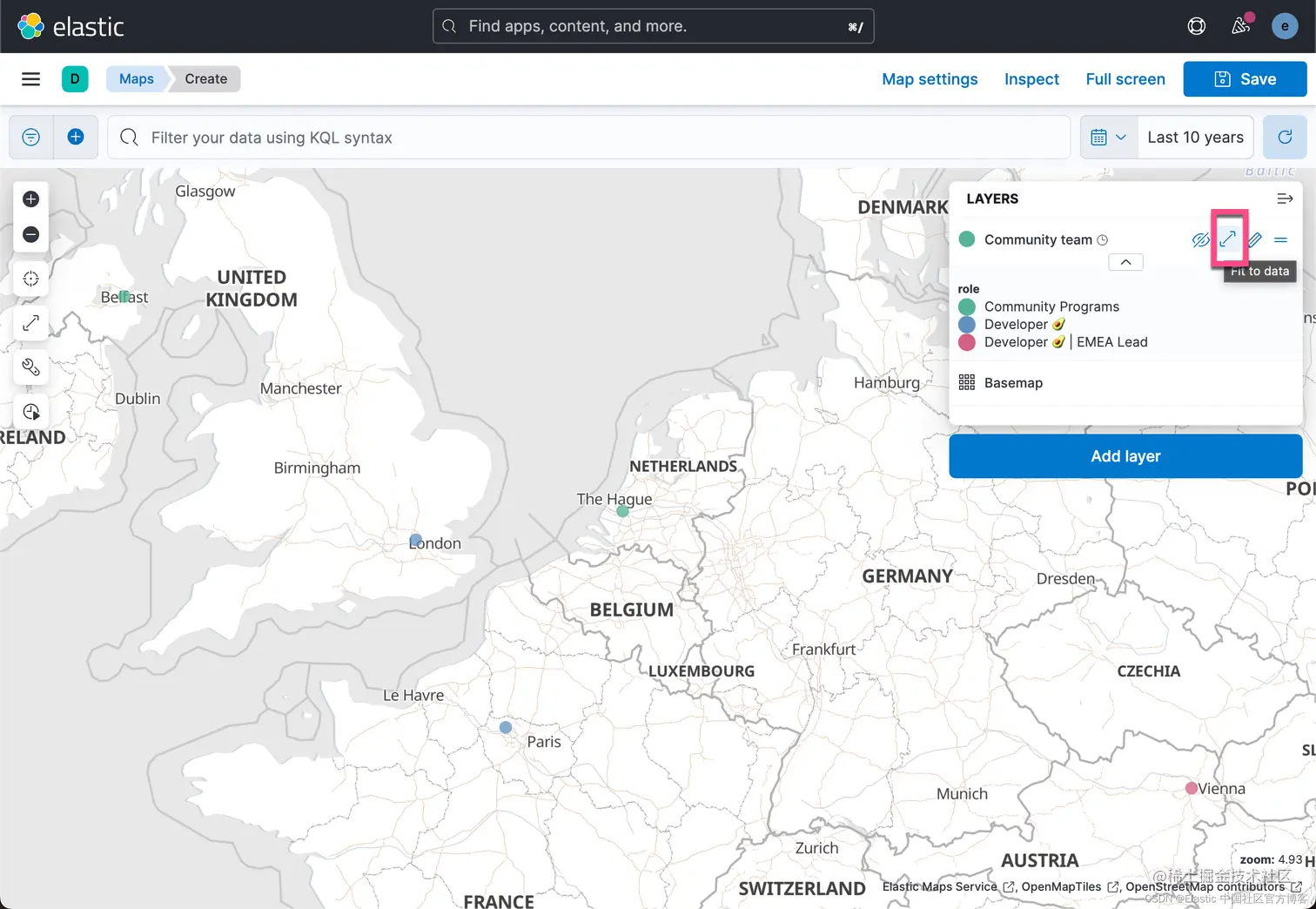 我们团队也有拥有某些区域的概念。 是时候向地图添加另一个图层了——这次是 Choropleth。 Elasticsearch 文档的 region 数组映射到国家/地区的 ISO 3166-1 alpha-2 代码。 我们可以将其限制为 “Community Programs 的角色,因为只有他们拥有区域: