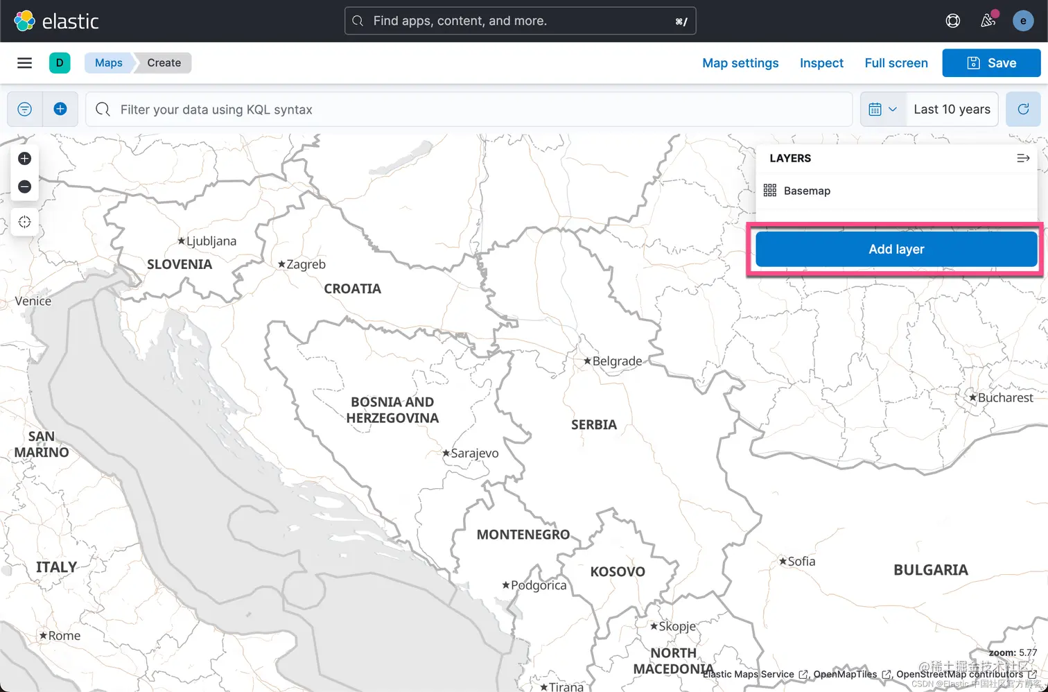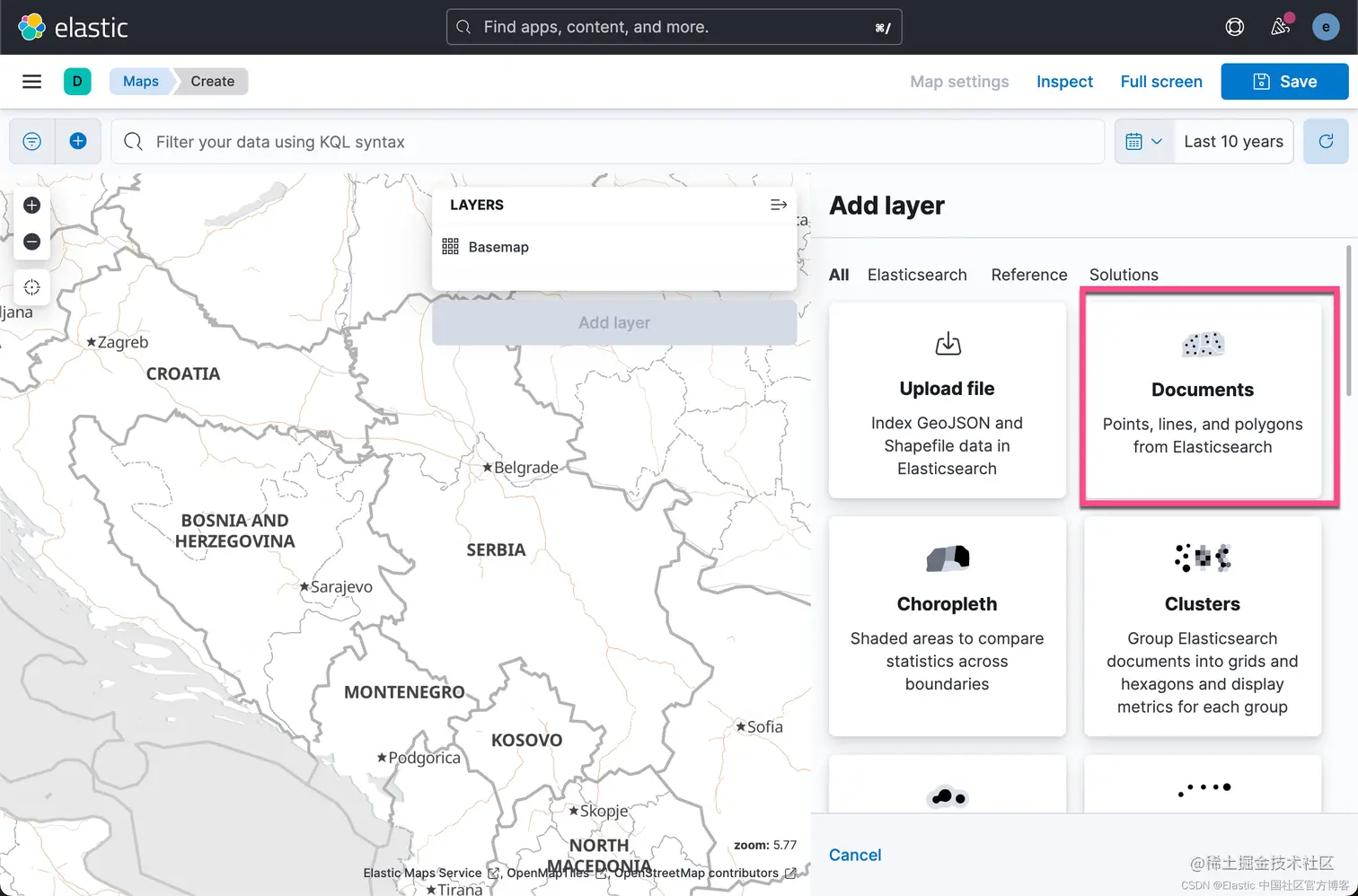 Kibana 中的地图有很多功能,但示例会使其保持简单。 添加一个文档(Documents)类型的层:
