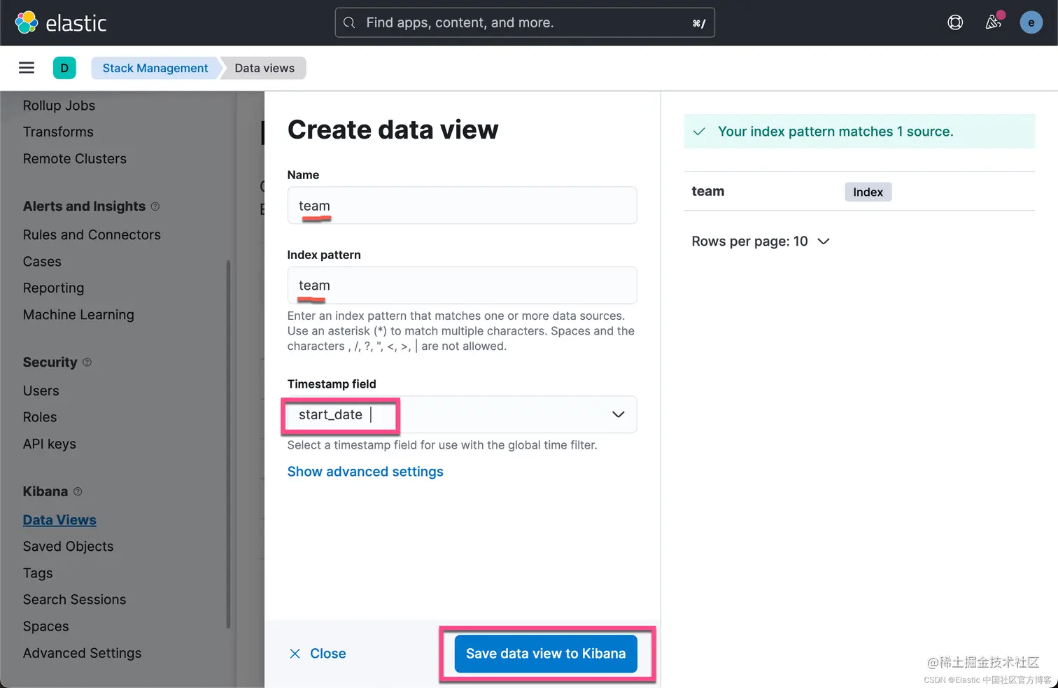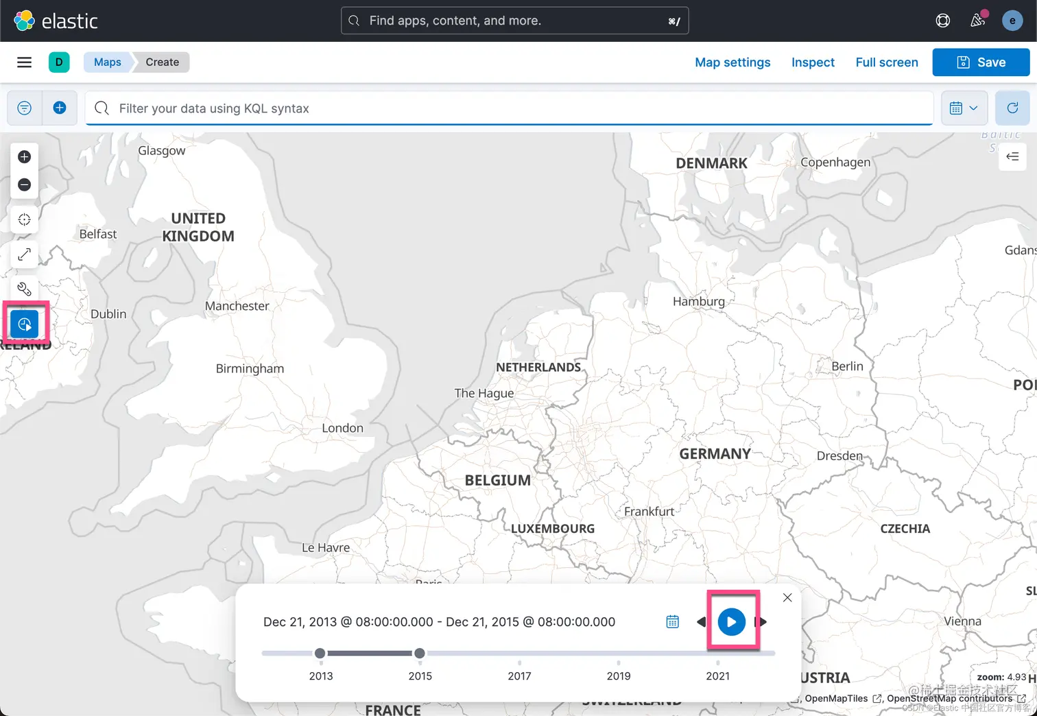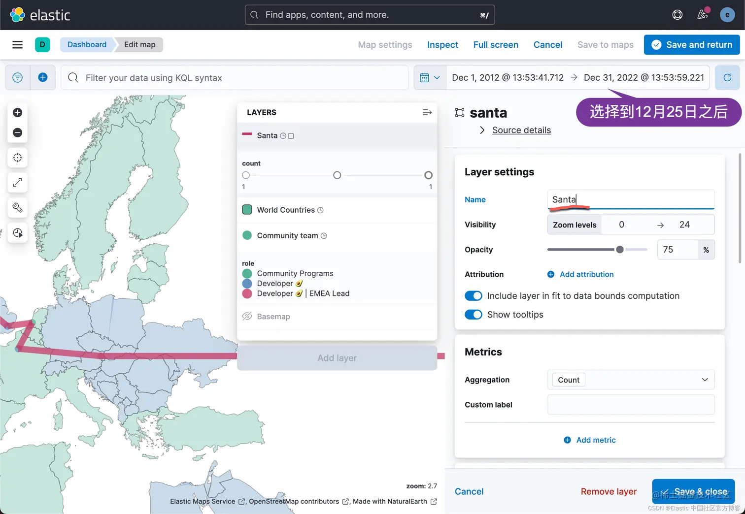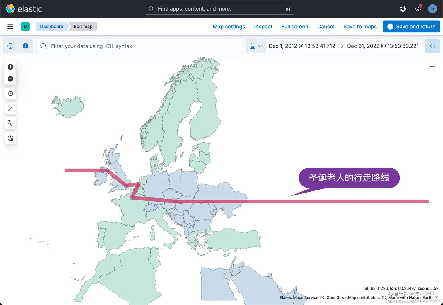 在上面,我们写入了6个文档。它形成了圣诞老人的行走轨迹。我们按照介绍的方法为这个新的索引 santa 创建一个 data view。