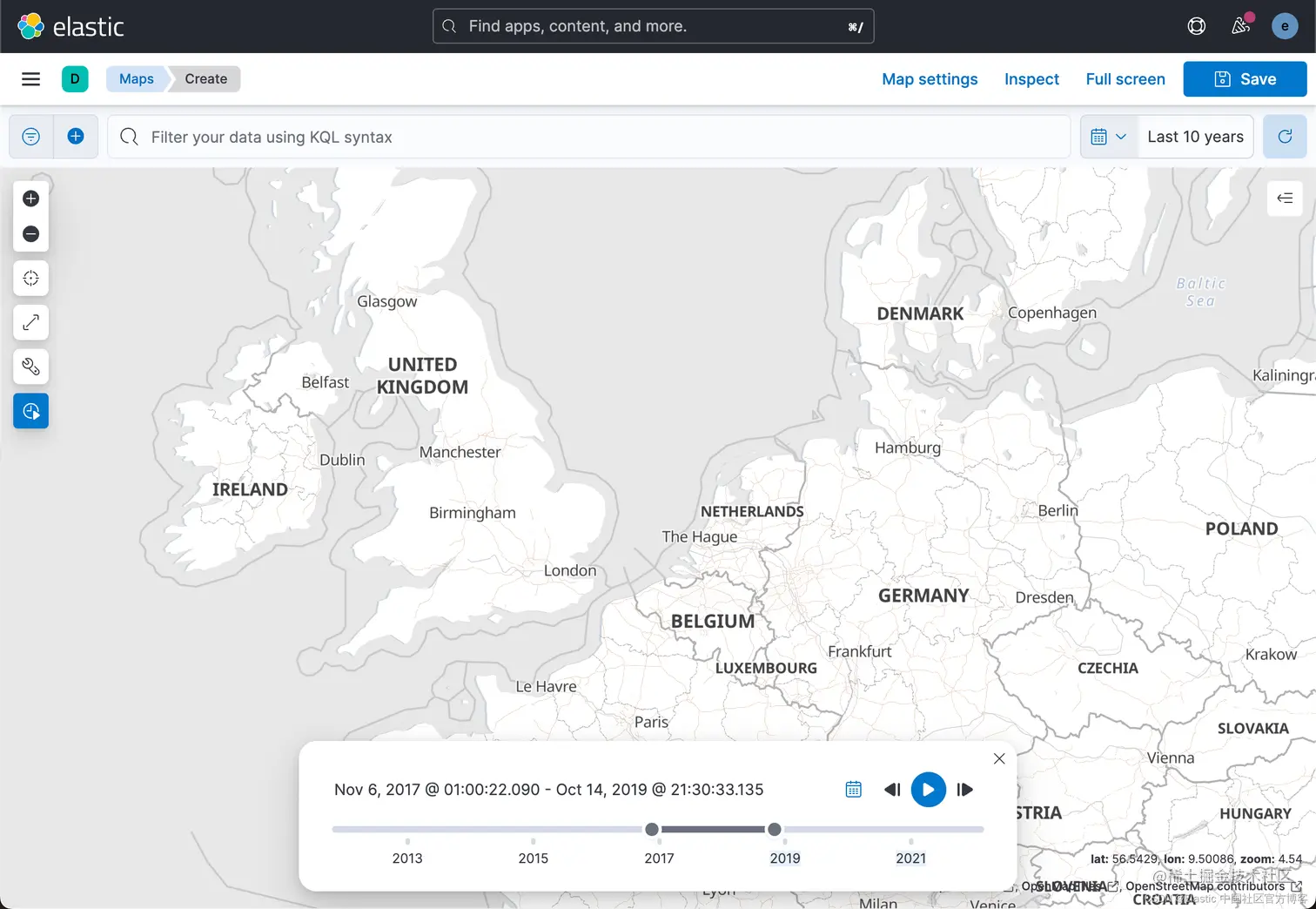 设置完成后,你可以在 Discover 中查看基础文档并将时间范围更改为 10 年(默认为 15 分钟):