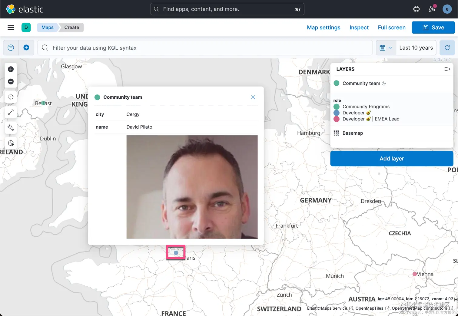 这就是我们让团队出现在地图上所需要的。点击上面的 Save & close 按钮。 如果你没有看到任何内容,请再次检查你是否选择了过去 10 年,而不仅仅是 15 分钟。 将鼠标悬停在其中一个上会显示他们的个人资料,你可以根据颜色判断他们的角色: