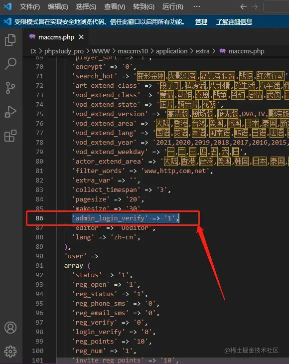 第一种方法是在MacCMS10文件夹下找到application文件夹,打开其中的extra文件夹,使用命令行编辑软件打开其中的“maccms.php”文件,找到“'admin_login_verify' => '1'”,将其中的“'1'”更改为“'0'”,以此关闭验证码功能。