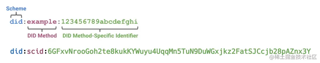 根据定义DIDs须包含DID Scheme、DID Method、DID Method Specific String三个部分,其中DID Scheme为DIDs的通用格式,针对不同方法定义了不同的格式;DID Method表示该DID Scheme是以何种方式运行在区块链或网络上;DID Method Specific String是由DID Method所产生出的识别符号,在所产生的集合中不与其他识别符号重复。