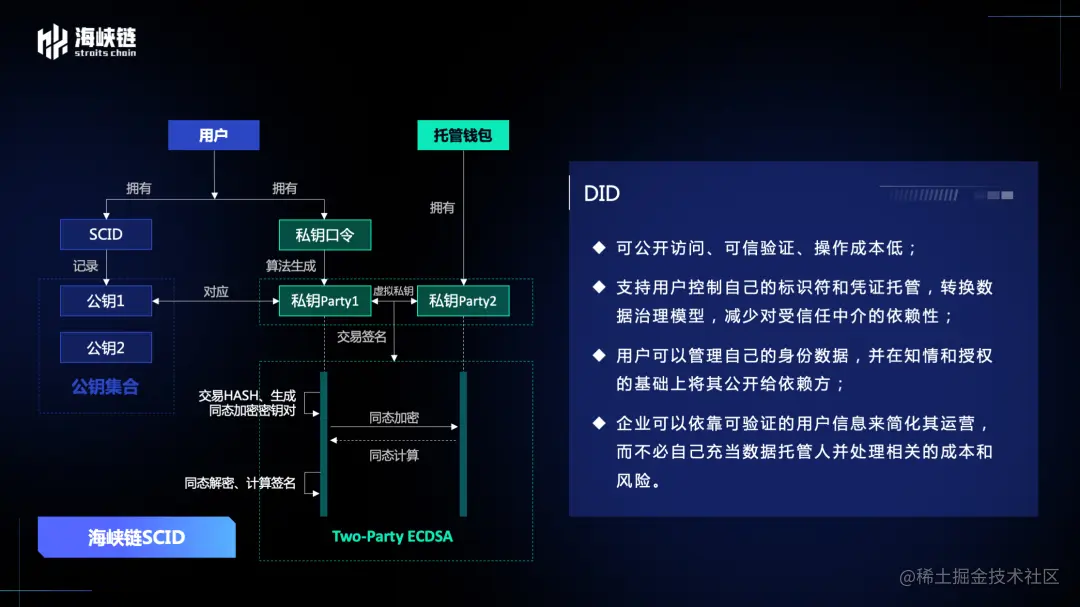 我们看到,基于 MPC 的密钥管理方案,更具广泛性、安全性与灵活性。因此,“海峡链”去中心化账户体系采用了基于MPC的密钥管理方案。