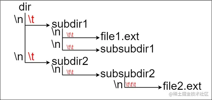 如果是代码表示,上面的文件系统可以写为 "dir\n\tsubdir1\n\t\tfile1.ext\n\t\tsubsubdir1\n\tsubdir2\n\t\tsubsubdir2\n\t\t\tfile2.ext" 。'\n' 和 '\t' 分别是换行符和制表符。
