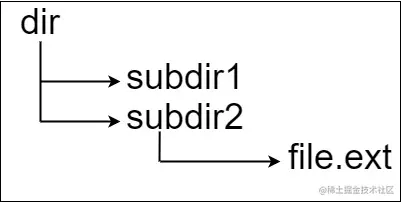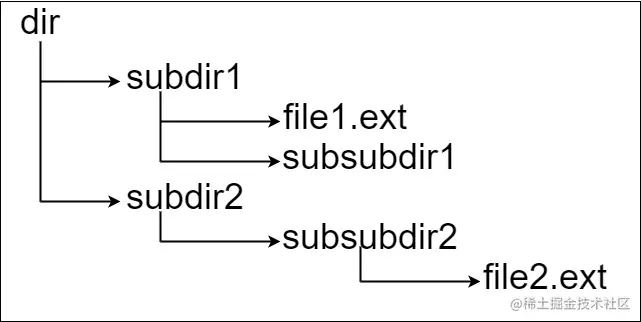这里将 dir 作为根目录中的唯一目录。dir 包含两个子目录 subdir1 和 subdir2 。subdir1 包含文件 file1.ext 和子目录 subsubdir1;subdir2 包含子目录 subsubdir2,该子目录下包含文件 file2.ext 。