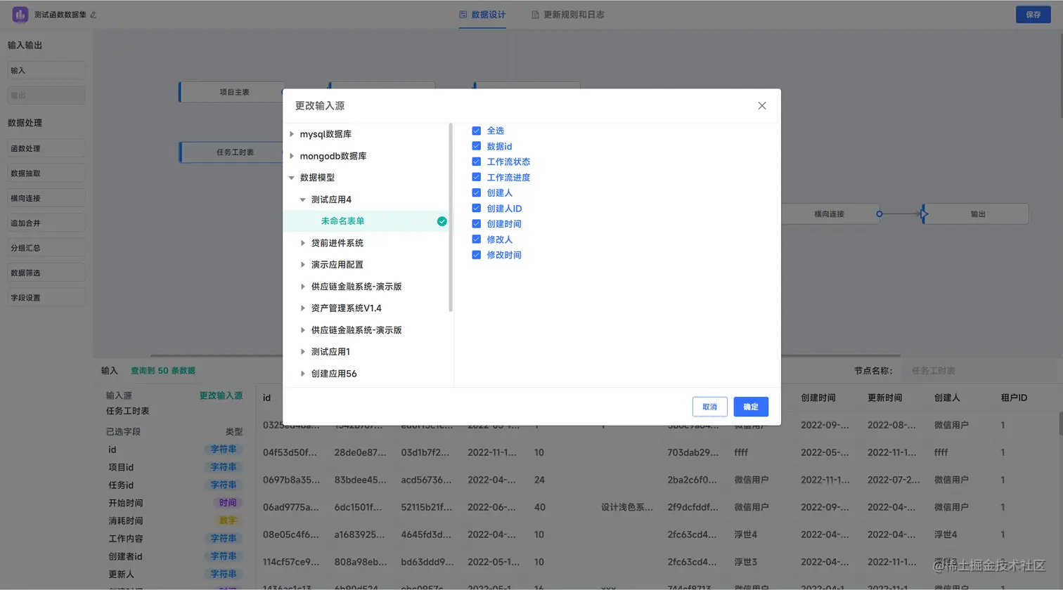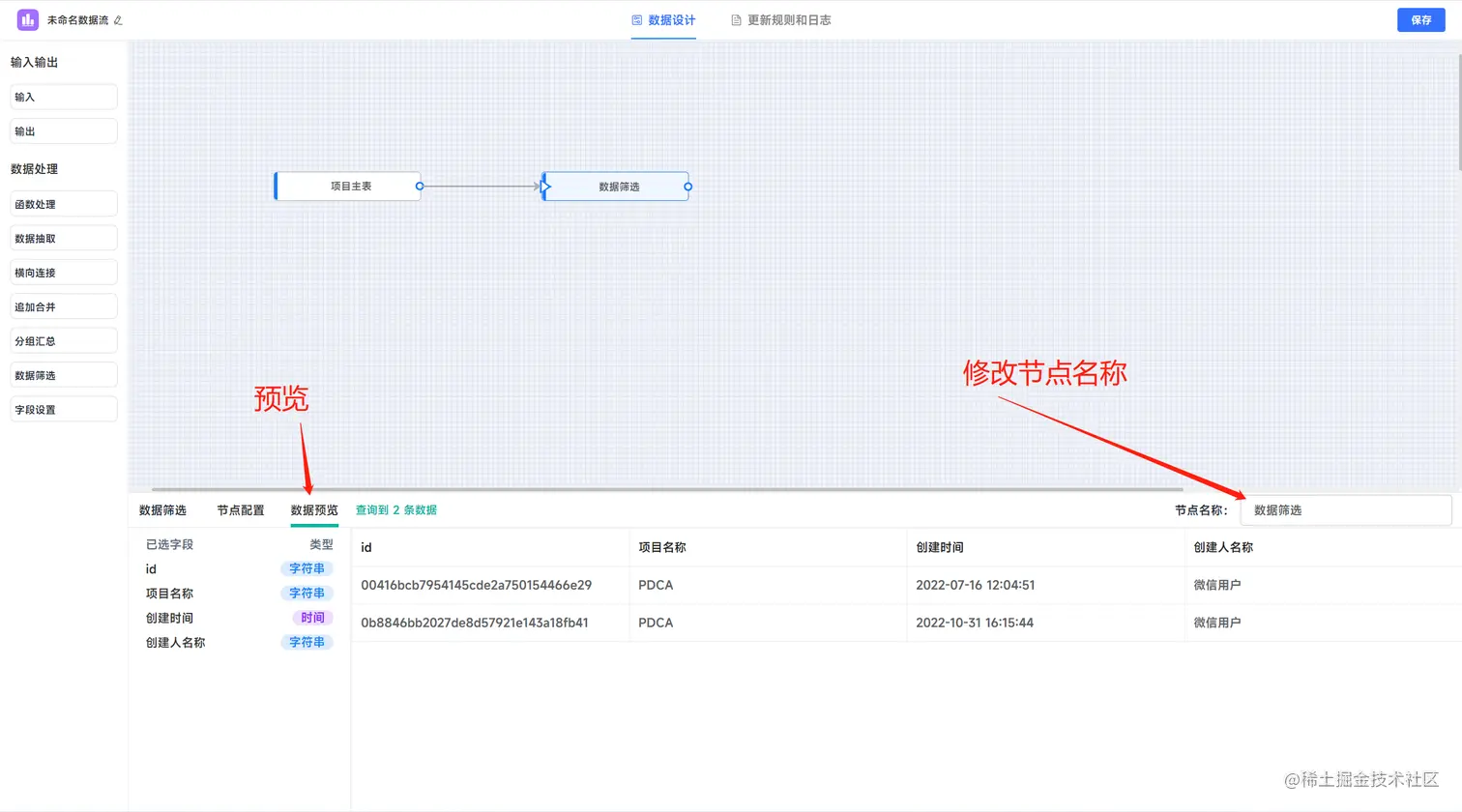 点击选择的数据输入节点,系统下侧展示数据节点的配置界面,左上角展示的数据查询的量(最大只能查询到50条,数据量过大不宜展示),并将选择的数据字段名称与类型,并把对应数据预览出来,如下图所示