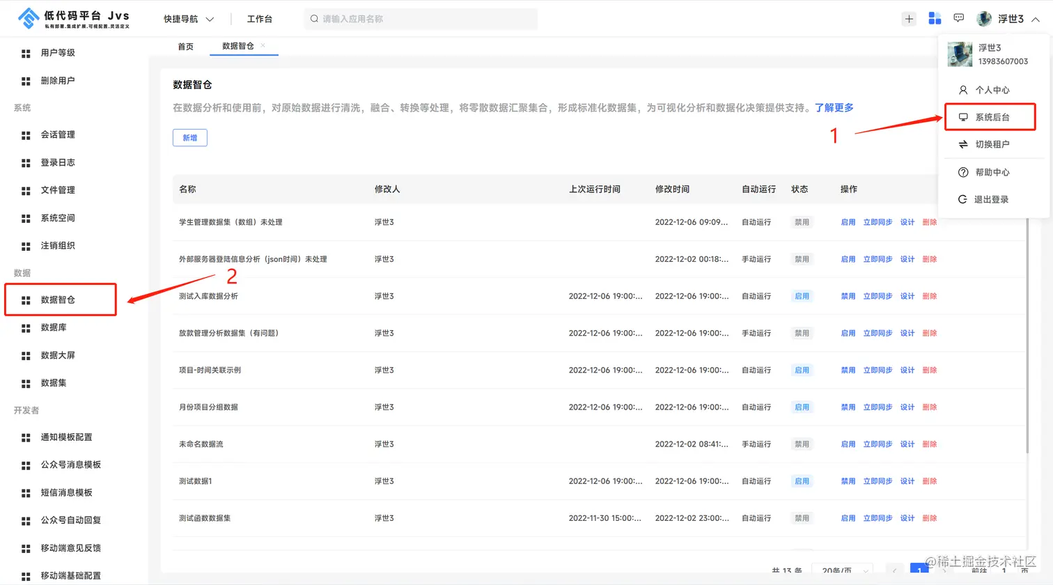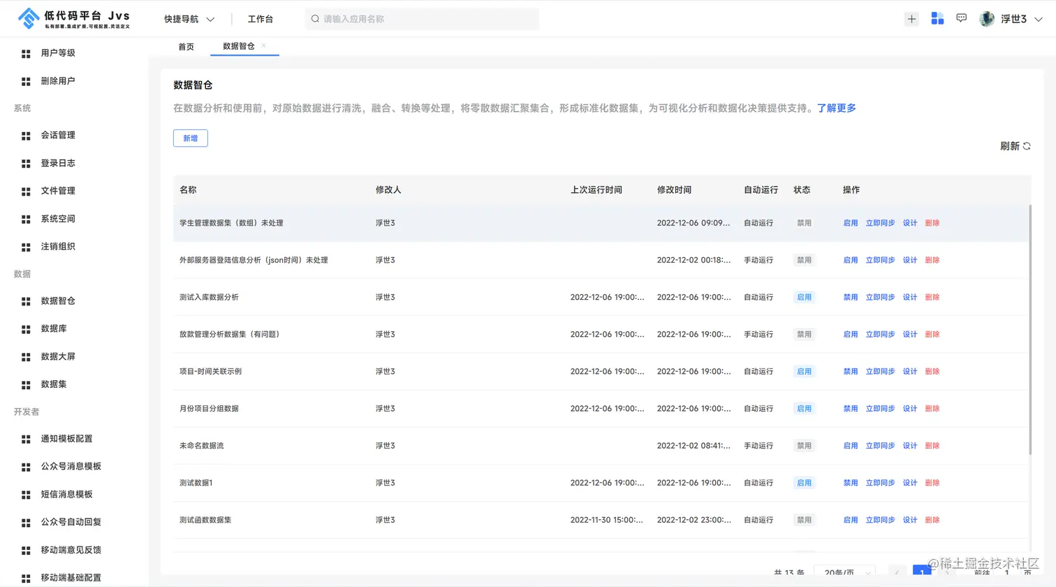 具备权限的人员从系统管理后台进入界面,点击数据智仓,右侧是展示系统中已经配置的数据集。