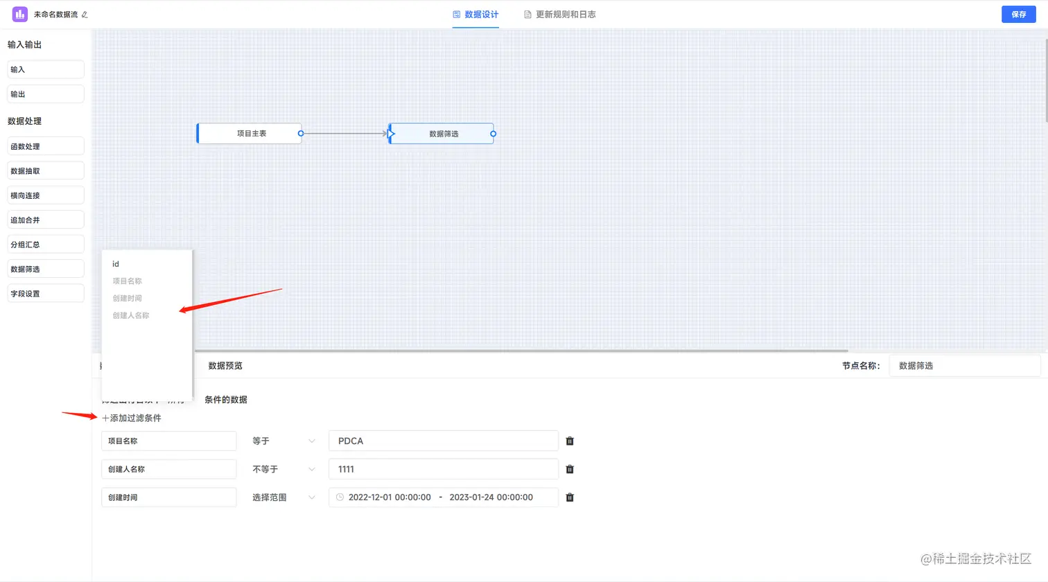 点击添加过滤条件,系统弹出上一个节点所提供的字段以供条件进行选择。