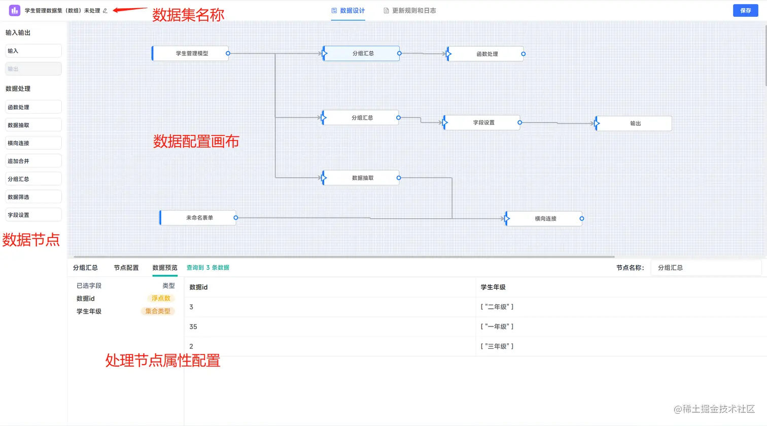 在数据集界面点击新增时,进入数据集设计界面。左上角可以设置数据集名称,左侧是系统提供的多种数据处理节点,主界面为数据配置画布,左侧的数据处理节点可以拖拽至画布,点击节点,下侧弹出对应的节点配置界面。
