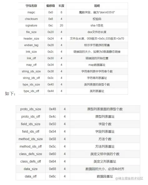 文件头记录了 dex 文件的一些基本信息, 以及大致的数据分布。其各字段及解释