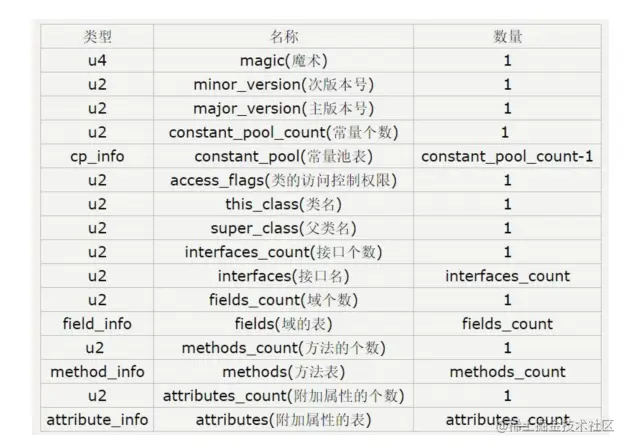1.Class 文件是一组以 8 位字节为基础单位的的二进制流。 2.各数据项目之间没有任何分隔符 3.Class 文件格式采用的结构只有两种数据结构:无符号数和表。 4.无符号数:以 u1,u2 等表示 1,2 个字节的无符号数,无符号数可用于描述数 字、索引引用、数量值、字符串值。 5.表:以多个无符号数或者表组成,通常以_info 结尾,整个 Class 文件就是一张