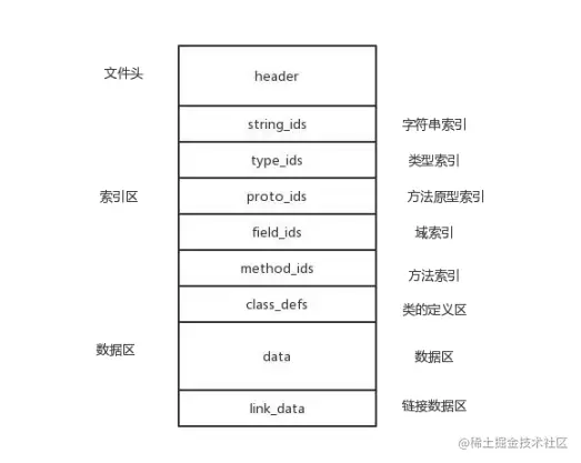 索引区中索引了整个 dex 中的字符串、类型、方法声明、字段以及方法的信息, 其结构体的开始位置和个数均来自 dex 文件头中的记录