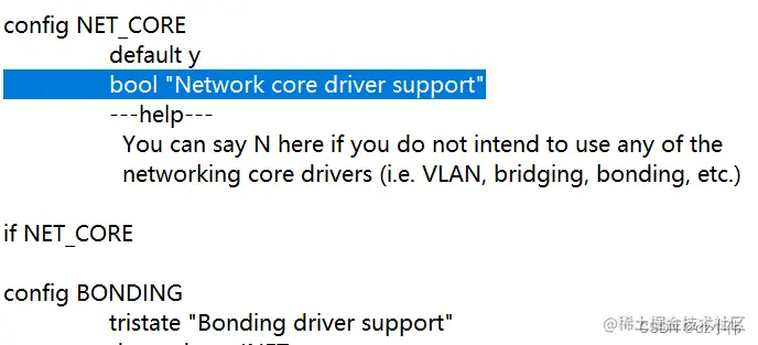 depends并不要求依赖的配置项一定是一个,可以是多个,而且还可以有逻辑运算config BONDING tristate "Bonding driver support" depends on INET depends on IPV6 || IPV6=n ---help--- Say 'Y' or 'M' if you wish to be able to 'bond' multiple Ethernet Channels together. This is called 'Etherchannel' by Cisco, 'Trunking' by Sun, 802.3ad by the IEEE, and 'Bonding' in Linux. The driver supports multiple bonding modes to allow for both high performance and high availability operation. Refer to <file:Documentation/networking/bonding.txt> for more information. To compile this driver as a module, choose M here: the module will be called bonding. -