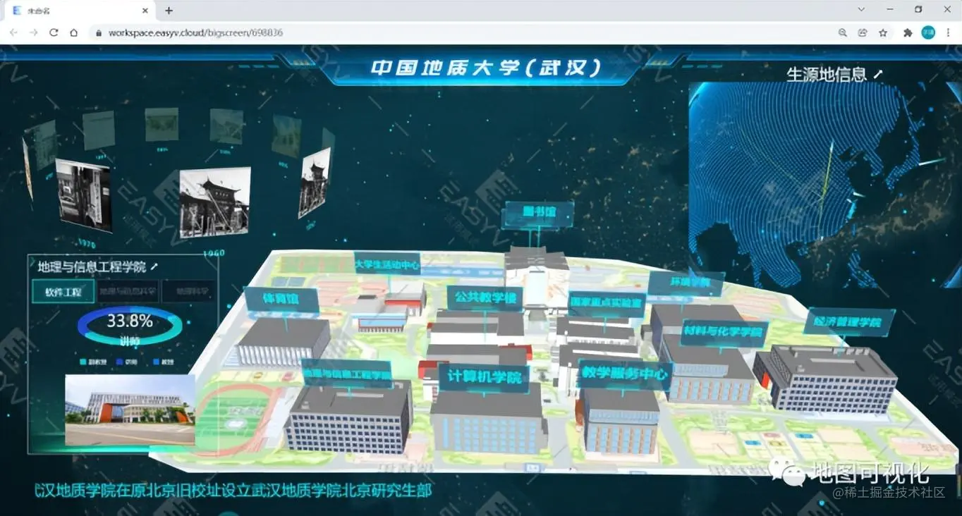 用EasyV打造校园地理信息可视化,这几位中国地质大学大学生只做了这几步!利用所搜集的地理数据,以二维地图与三维模型相结合的形式进行数据可视化,在EasyV数字孪生可视化平台的助力下,中国地质大学(武汉)地理与信息工程学院地理信息科学专业学生李子琪、邵轶辉所在小组成功实现了校园地理信息可视化展示,为地大送出一份弥足珍贵的七十华诞礼物。