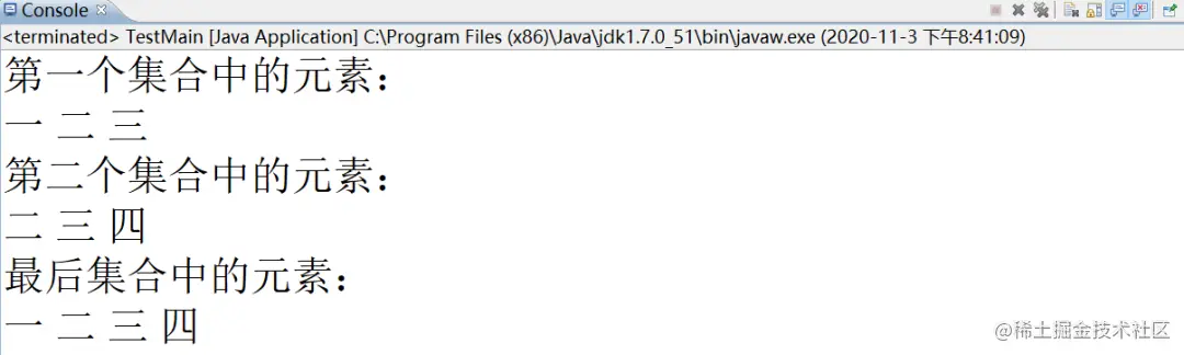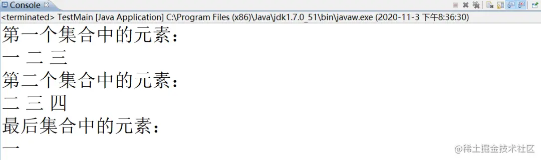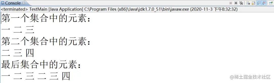 代码分析,我们先使用差集,过滤一下list1中所有在list2中出现的元素,出现了就删除,也就是remoAll方法调用完之后,list1中还剩 “一” ,然后list2中还有 “二、三、四” ,两个一并集,自然结果就是 “一、二、三、四” 。