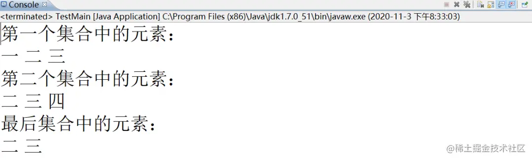 即两个集合中都有的元素,一个有另一个也有的,代码如下:(省略声明和初始化集合的代码,和第一个示例一样)