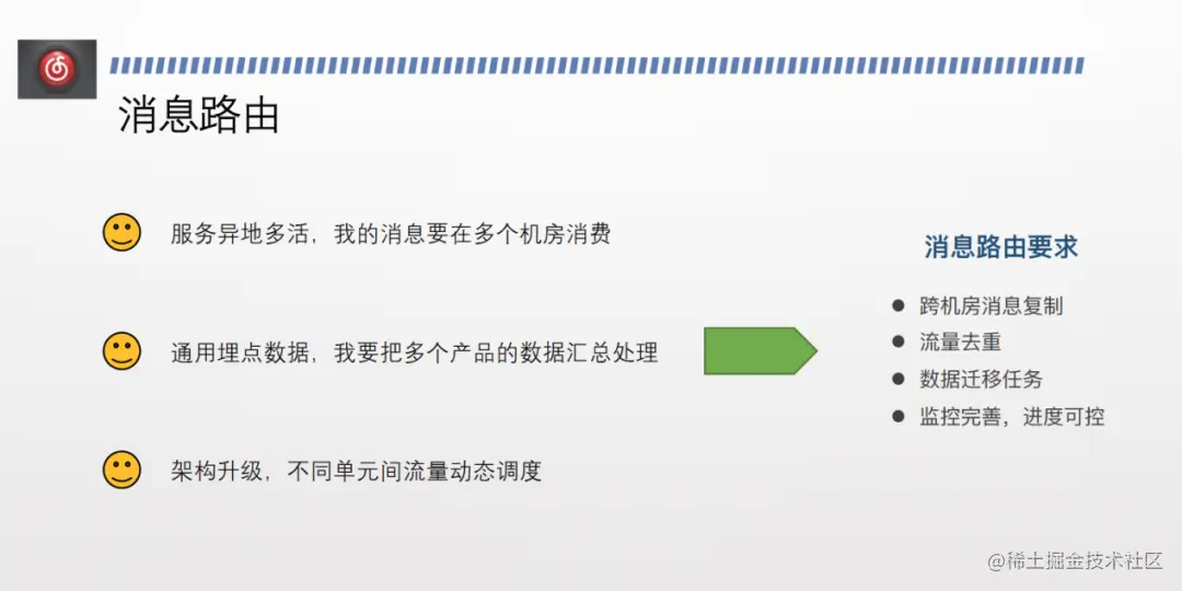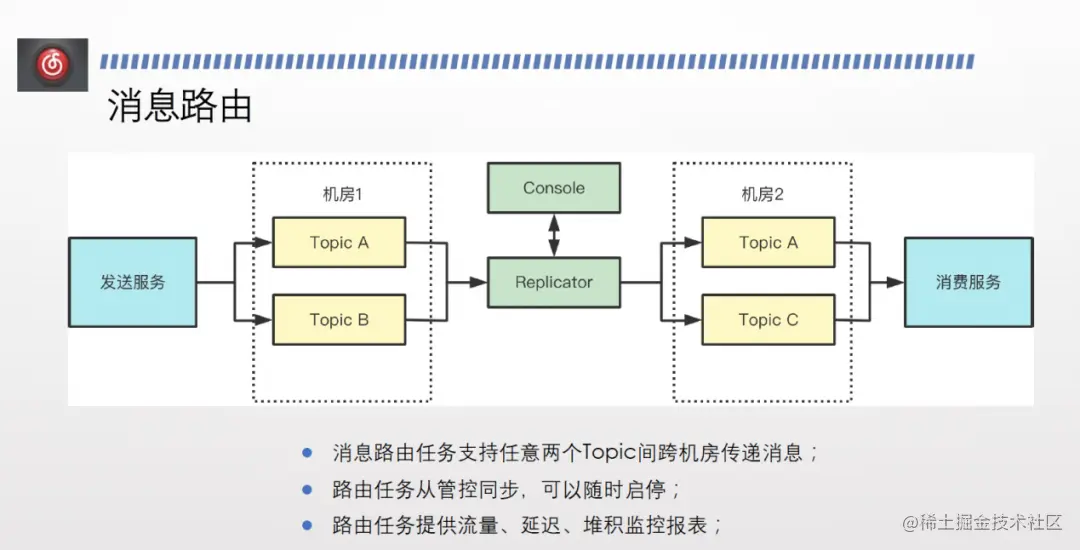 ②流量去重:消息路由在复制时不可避免会有失败,因此必然有内部的重试,可能会导致有消息重复;此外,双向路由必然需要提供双向复制,而两边 topic 名字一样,复制时会导致错乱,因此需要有标签来实现流量重。