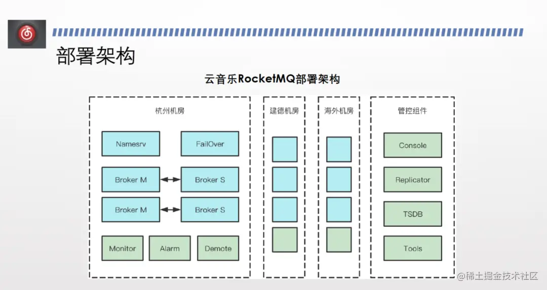 云音乐目前有三个机房,每个机房部署了一套 RocketMQ 集群,除了 Manesrv、 HA 等基础组件,还有自研或开源改造的组件,比如 monitor 组件、告警巡检组件、降级维稳组件等。