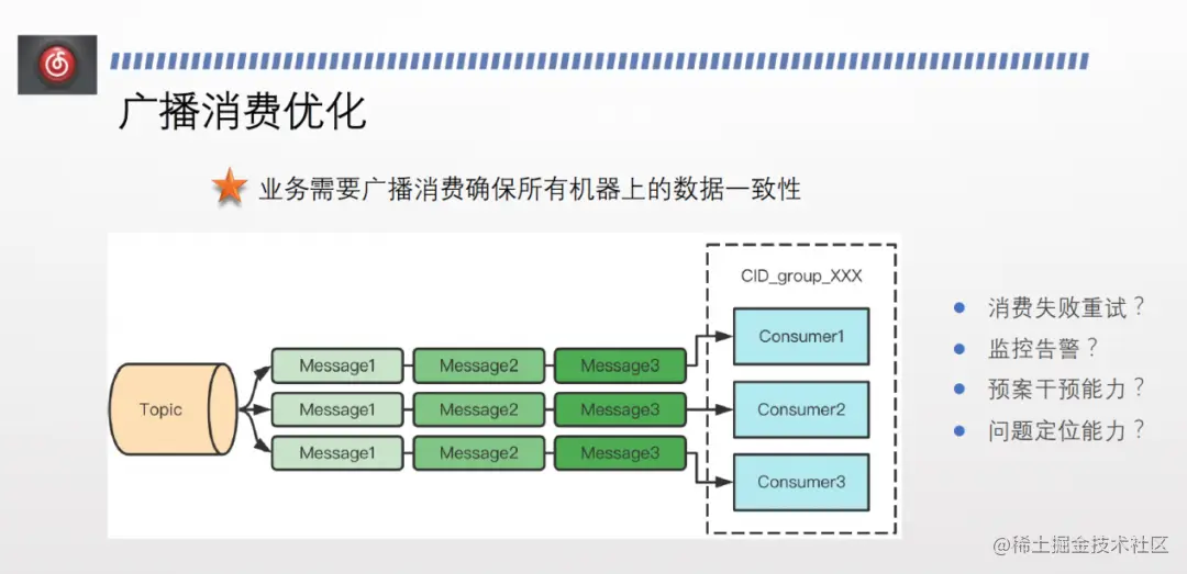 广播消费场景下,通常需要确保所有机器上的数据最终一致。而开源的广播消费失败后不会重试也不会告警。且消费位点为 local,不会上报到远端,如果本地服务重启则offset 丢失,并且无法做预案干预。同时因为不上报,缺少问题定位的能力。