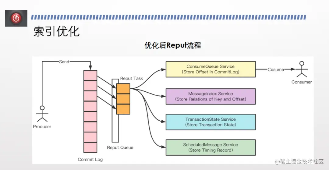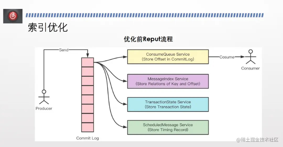开源版本下, commit log 写入之后,会有 Reput service 方法建 consumer queue 、index 索引等一套流程,从头扫到尾,块状地建立 consumer queue。