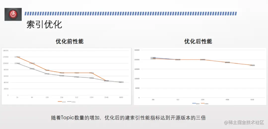 优化后,建索引的速度基本与发送速度持平,且性能不会随着 topic 数量增加而大幅下降。优化后建索引的性能达到优化前的3倍,保证了消费性能。