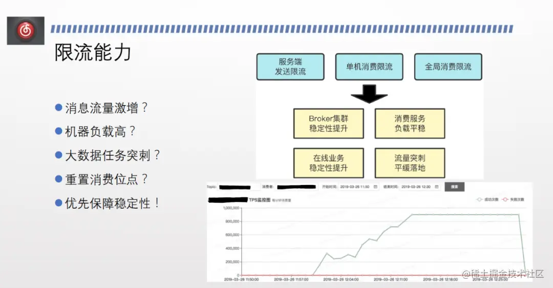 第一,服务端的发送限流。支持 topic 级别,也支持 group 级别。后续将支持客户端级别,支持多个维度的发送端限流。