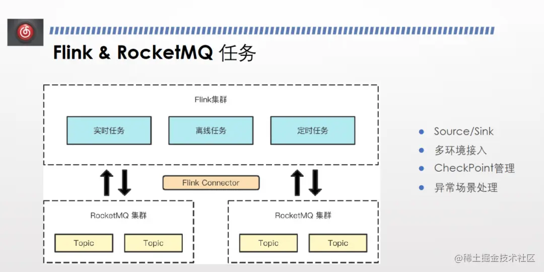 因为内部封装了接口和集群配置,RocketMQ 作为 Flink 的 source 和 sink 需要有数据源的配置。我们对数据源做了封装,比如 connector 如何解析元数据,从而正确地连接数据源、读写消息。