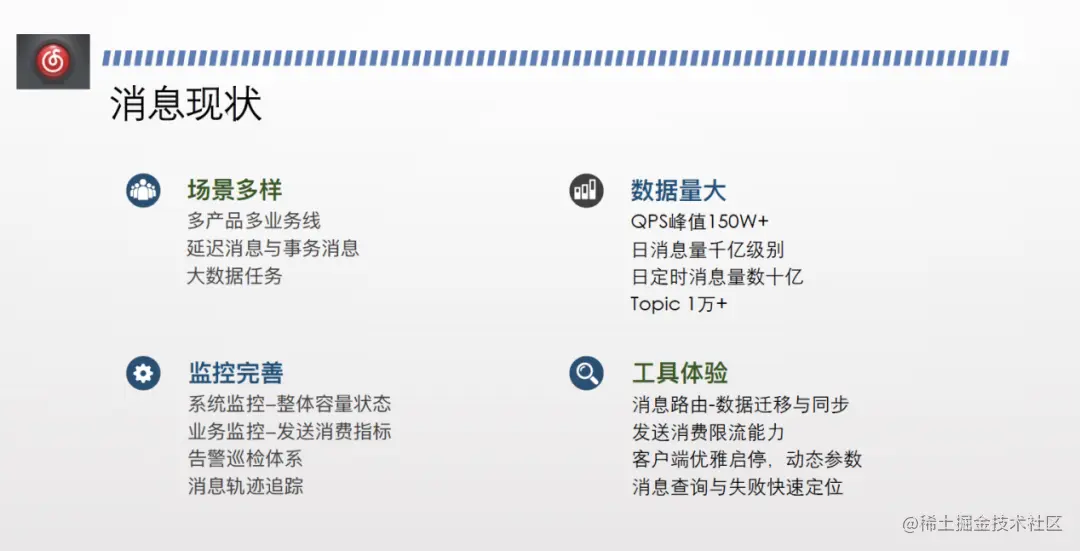 另外,我们也提供改了一些工具帮助业务方提升使用 RocketMQ 的体验,比如数据迁移和同步消息路由的组件,提供稳定性保障的限流能力、降级能力以及动态参数干预的预案能力。当线上业务方发现消费不符合预期时,需要提供查询帮助其快速定位,以及提供死信处理工具等。
