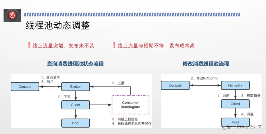 此外,我们提供了非常简单的修改方式。在管控端修改 kv config 并上报到 NameSvr ,NameSvr 监听并下发。客户端监听到 kv config 变化后将最新配置下拉。然后再本地找到 topic 对应的线程池,修改 coresize、maxsize 值。