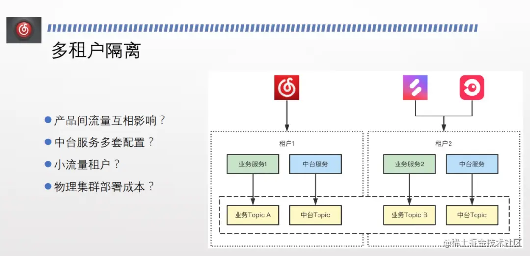 网易云音乐拥有多个流量入口,不同业务的数据和流量需要做隔离,每个租户下都是一套独立的业务线。而物理隔离成本过高,因此我们实现了逻辑隔离。各个业务之间流量不互通,逻辑上无法相互调用,且租户下所有 topic 名字一致,中台只需要切换租户名,无需改动任何其配置、代码,即可直接上线。