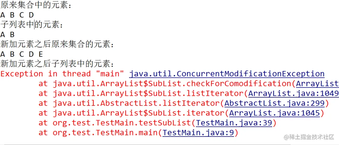 居然报错了?并且是在原集合中新加元素之后遍历子列表时报的错。ConcurrentModificationException是并发修改异常,但是我们这里并没有多线程操作,何来并发异常?其实,原因很简单,那就是subList方法是原列表的子列表,当原来的集合(原列表)修改之后,subList取出的子列表并未跟着一起修改,也就是不会生成新列表,最后在最字列表操作时,程序就会发现修改计数器(Modification)与预期的不符合,故抛出此异常。