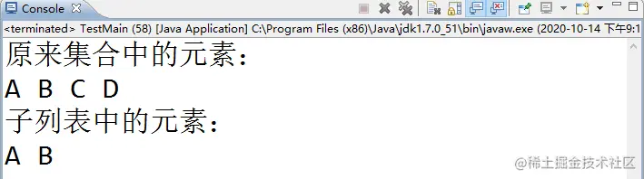 这块代码很好理解,无外乎就是初始化了个集合,并添加了几个元素,通过subList方法返回了一个子列表,最后将两个列表中的元素都遍历出来。