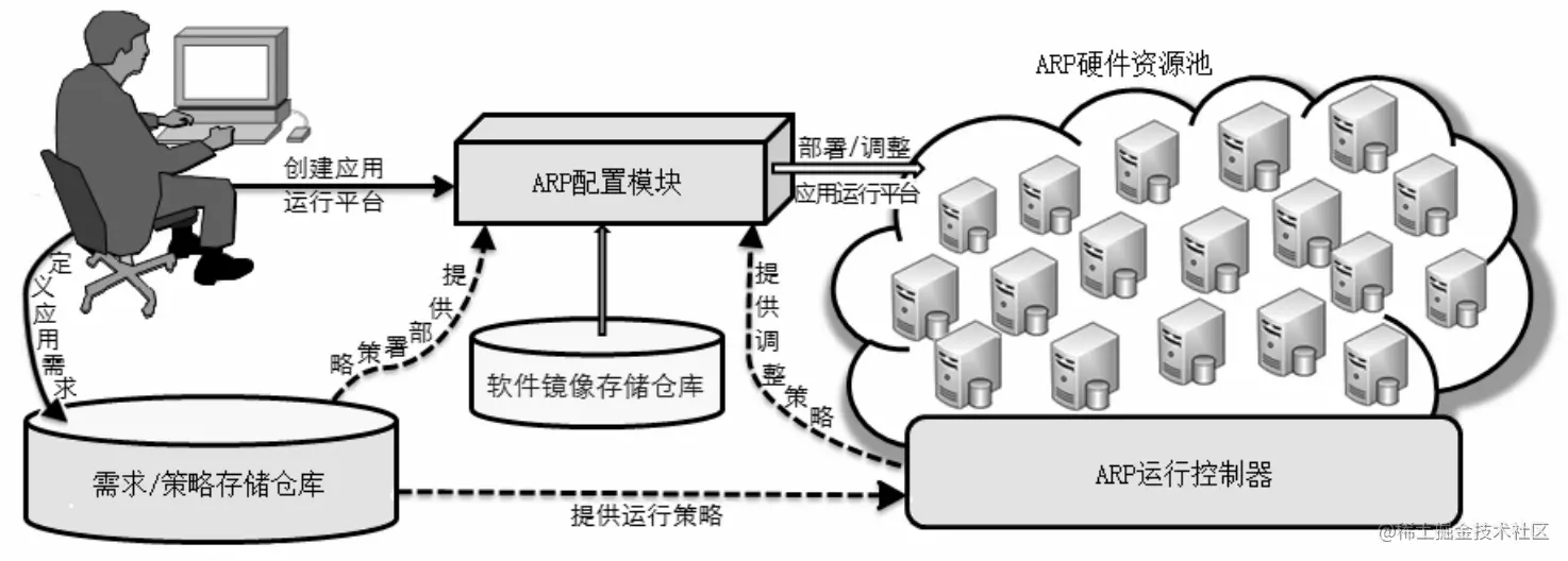 PaaS作为云应用的运行环境,云应用通过PaaS所提供的编程接口API按需获取运行所需要的各种(虚拟的)资源和能力。一般来讲,资源的获取是动态及时的。例如,平台层根据应用程序的负载起伏,动态估计所需的计算和存储资源,按照服务质量的约定(SLA)按需提供所需资源。从自动化的角度来看,PaaS的基本目标是使应用更加专注在用户的功能性需求上,而平台则自动为应用满足诸如负载均衡、自动规模调整等非功能性的需求及管理的需要。