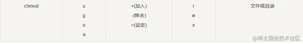 此外, a 则代表 all,即全部的身份。读写的权限可以写成 r, w, x,也就是可以使用下表的方式来看: