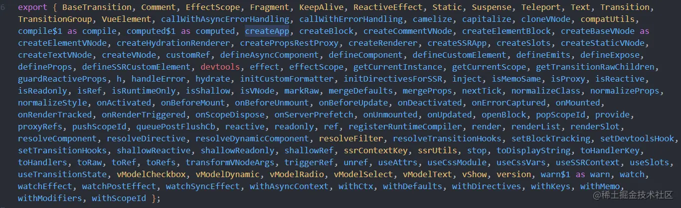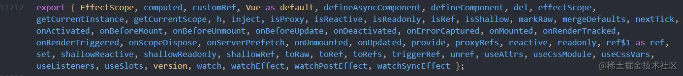 接下来看一下是如何处理Vue2.7版本的导出的,和Vue2.6之前的版本相比,Vue2.7直接内置了@vue/composition-api,所以除了默认导出Vue对象外还导出了组合式API: