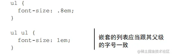 会发现每一个字体比上一级要小,因为样式在落定时才开始计算的,由于所有的ul的字号都使用同一个样式0.8em,且ul都是相互嵌套的,所以当前ul将会是上一级ul字号的0.8倍。所以会不断缩小。