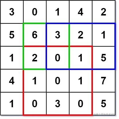 输入: ["NumMatrix","sumRegion","sumRegion","sumRegion"] [[[[3,0,1,4,2],[5,6,3,2,1],[1,2,0,1,5],[4,1,0,1,7],[1,0,3,0,5]]],[2,1,4,3],[1,1,2,2],[1,2,2,4]] 输出: [null, 8, 11, 12] 解释: NumMatrix numMatrix = new NumMatrix([[3,0,1,4,2],[5,6,3,2,1],[1,2,0,1,5],[4,1,0,1,7],[1,0,3,0,5]]]); numMatrix.sumRegion(2, 1, 4, 3); // return 8 (红色矩形框的元素总和) numMatrix.sumRegion(1, 1, 2, 2); // return 11 (绿色矩形框的元素总和) numMatrix.sumRegion(1, 2, 2, 4); // return 12 (蓝色矩形框的元素总和)
