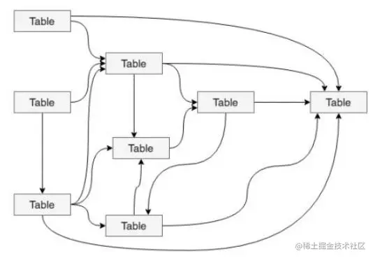 但是,大多数情况下,我们完成的数据体系却是依赖复杂、层级混乱的。如下的右图,在不知不觉的情况下,我们可能会做出一套表依赖结构混乱,甚至出现循环依赖的数据体系。