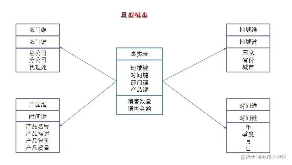 星型模型将业务流程分为事实和维度。事实是对业务的度量,是定量的数据,比如价格、销售数量、距离、速度、质量等。维度是对事实数据属性的描述,比如日期、产品、客户、地理位置等。