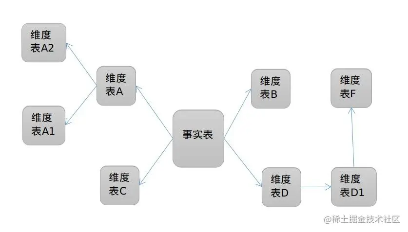 是一种多维的数据关系。一个事实表为中心,多个维度表环绕周围。