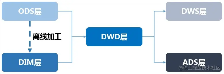 又称通用数据模型层。包括DIM维度表、DWD和DWS,由ODS层数据加工而成。主要完成数据加工与整合,建立一致性的维度,构建可复用的面向分析和统计的明细事实表,以及汇总公共粒度的指标。