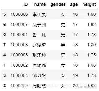 若想按年龄升序身高降序排列数据框,可在python中输入如下语句: