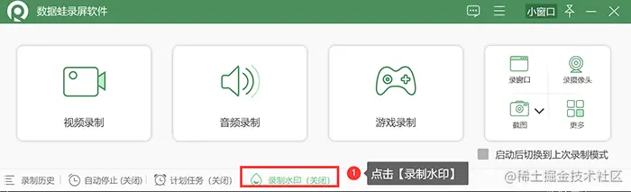 **第1步:**双击已经下载好的数据蛙录屏软件,进入软件主界面后,可以在主界面的下方看到【录制水印】功能。