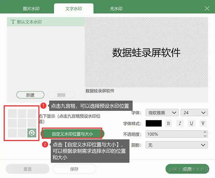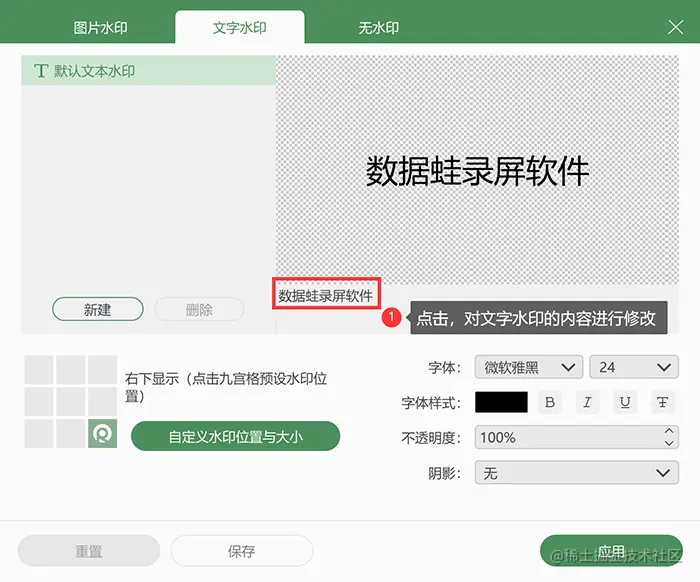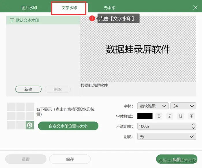 (注:如果不修改文字水印的内容,则是添加默认的文字水印“数据蛙录屏软件”。)