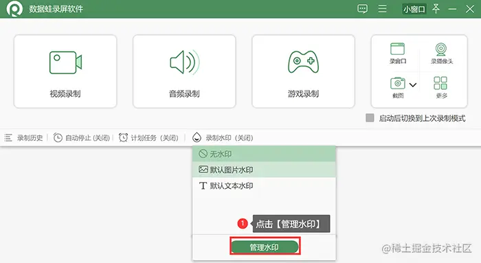 (注:数据蛙录屏软件录制的视频都是默认“无水印”的,这个【录制水印】是默认关闭的,如果您需要设置自己的水印,请在录制开始前,打开此功能哦!)